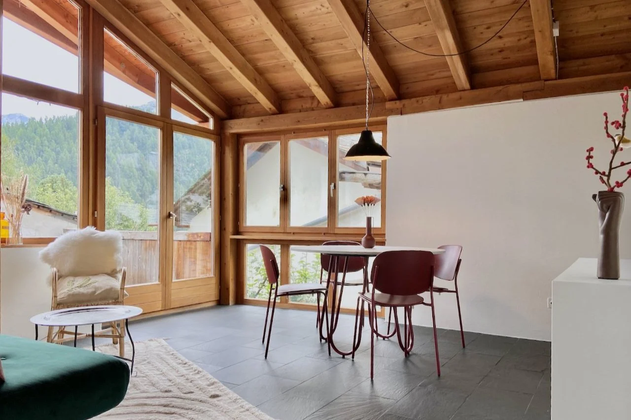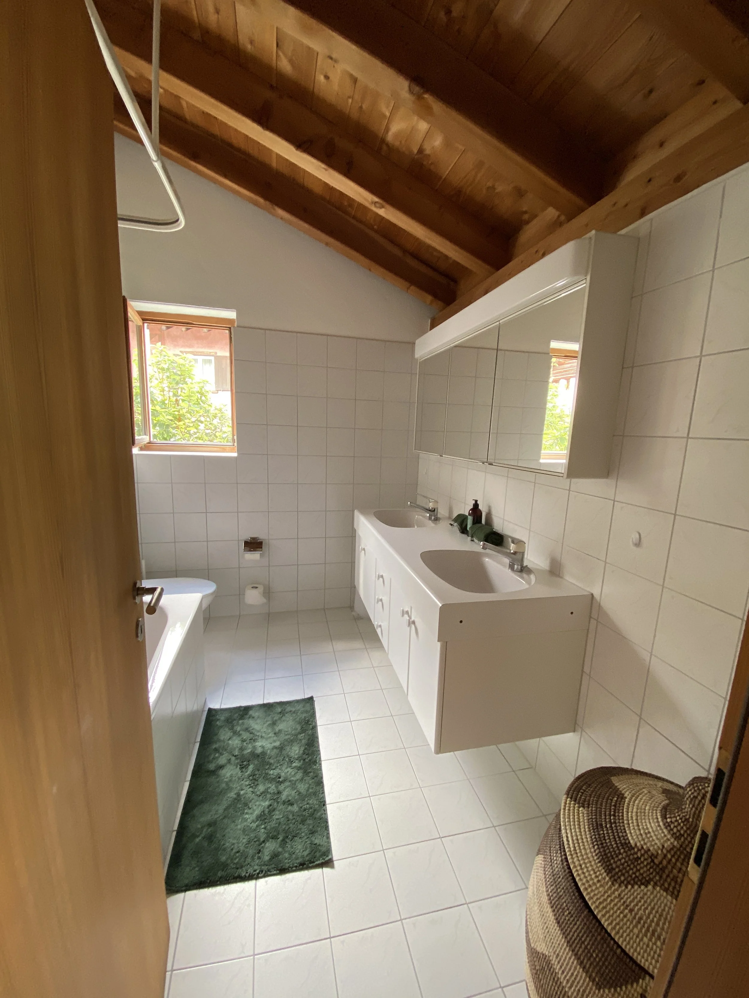 Die helle 3.5 Zimmerwohnung unter dem Dach ist mit zwei Schlafzimmern ein idealer Ort für bis zu vier Personen. Das Lichtdurchflutete Wohnzimmer gibt Ausblick auf die Bergen. Davor steht auch die Terrasse mit Esstisch zur Verfügung.